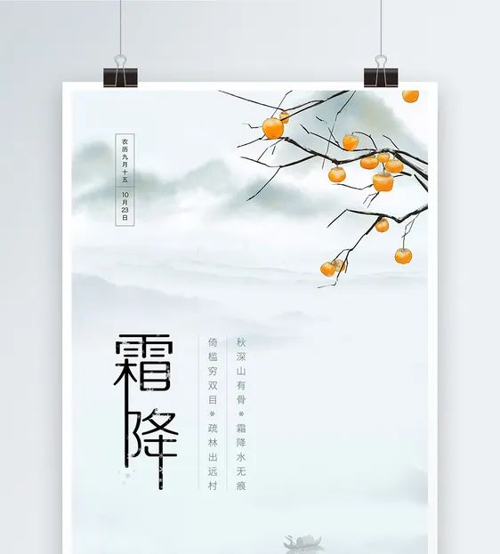 霜降二十四節(jié)氣之一,天氣漸冷,開始有霜。霜降一般是在每年公歷的10月23日,太陽(yáng)到達(dá)黃經(jīng)210度時(shí)為二十四節(jié)氣中的霜降。霜降是秋季的最后一個(gè)節(jié)氣,是秋季到冬季的過渡節(jié)氣。秋晚地面上散熱很多,溫度驟然下降到0度以下,空氣中的水蒸氣在地面或植物上直接凝結(jié)形成細(xì)微的冰針,有的成為六角形的霜花,色白且結(jié)構(gòu)疏松。